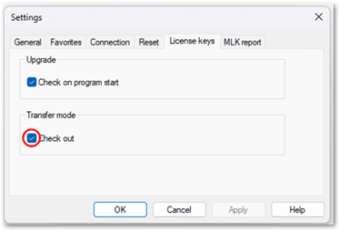 3. Go to the “License keys” tab in the Settings dialog and select the check box “Check out” under “Transfer Mode”