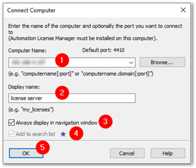 e. Select the "Always display in navigation window" check box if you want the entered computer to be available after a restart of the Automation License Manager.