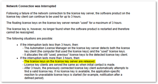 Here’s the link to the manual which describes how a floating license key reacts to the failure of the computer connection. Note that after 3 hours of a client disconnecting from the license server, the license key on the license server is then “released” (meaning made available for other clients to use).